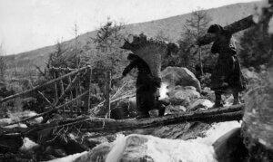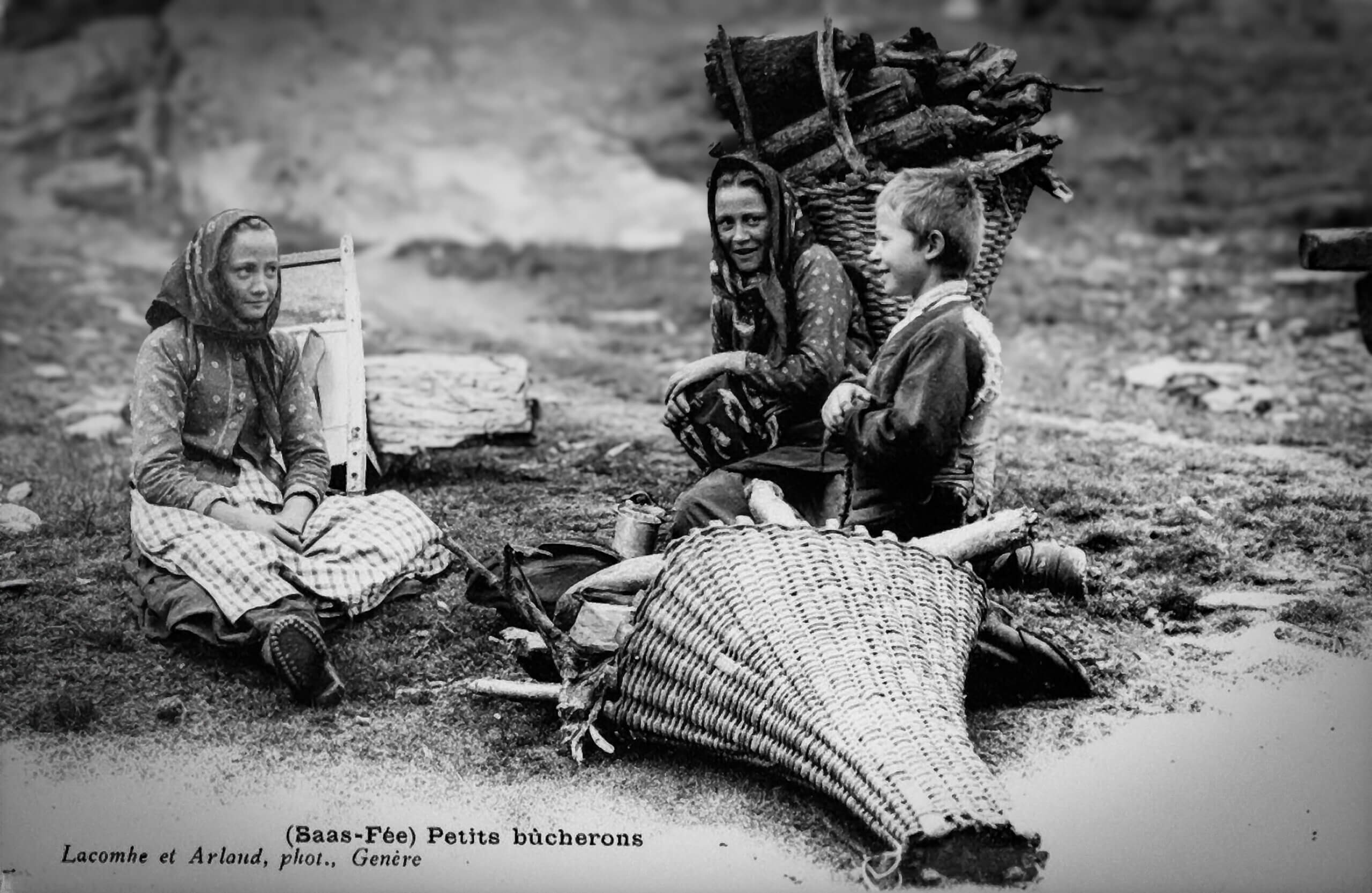 Frauen und Kinder beim Holzen